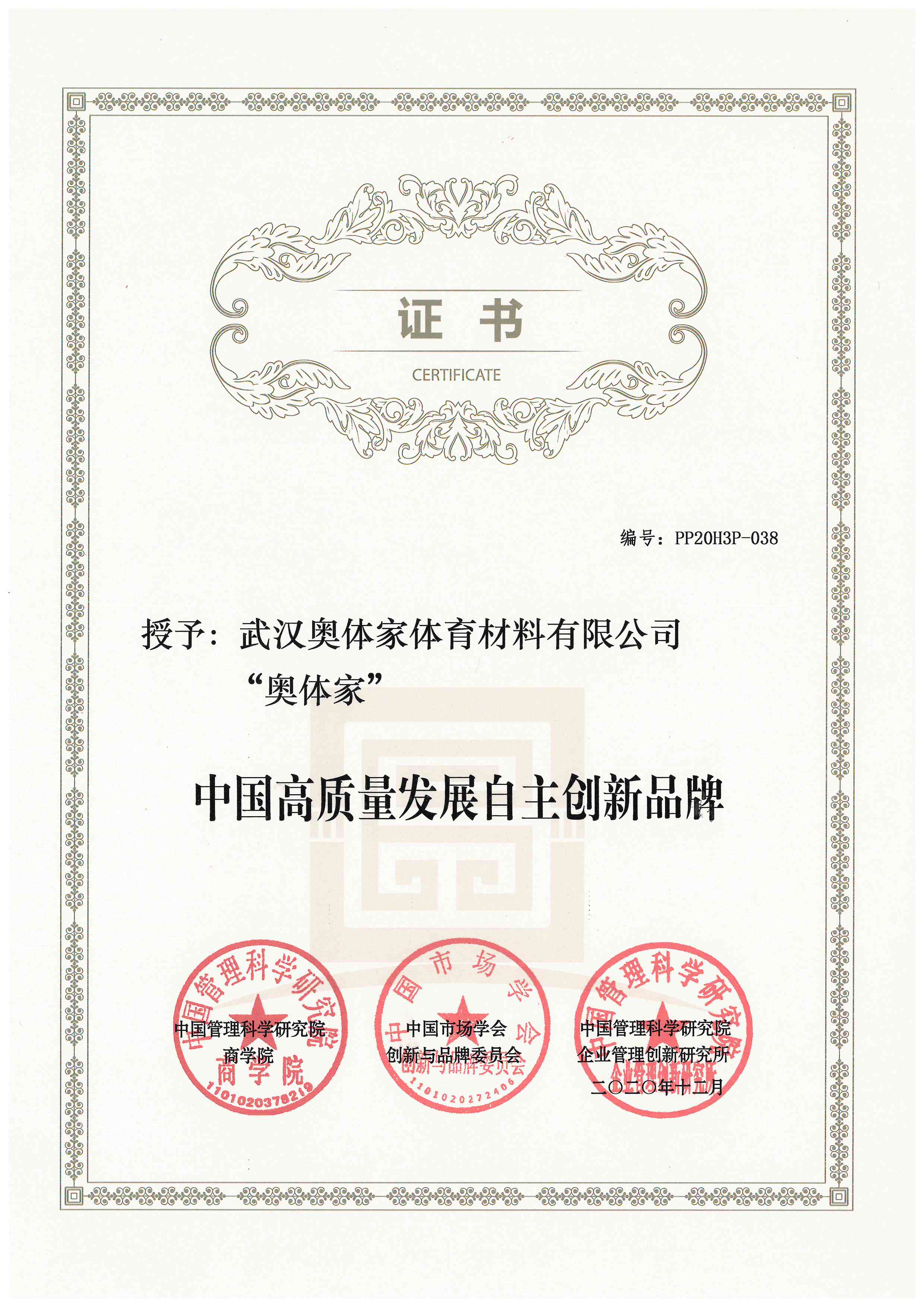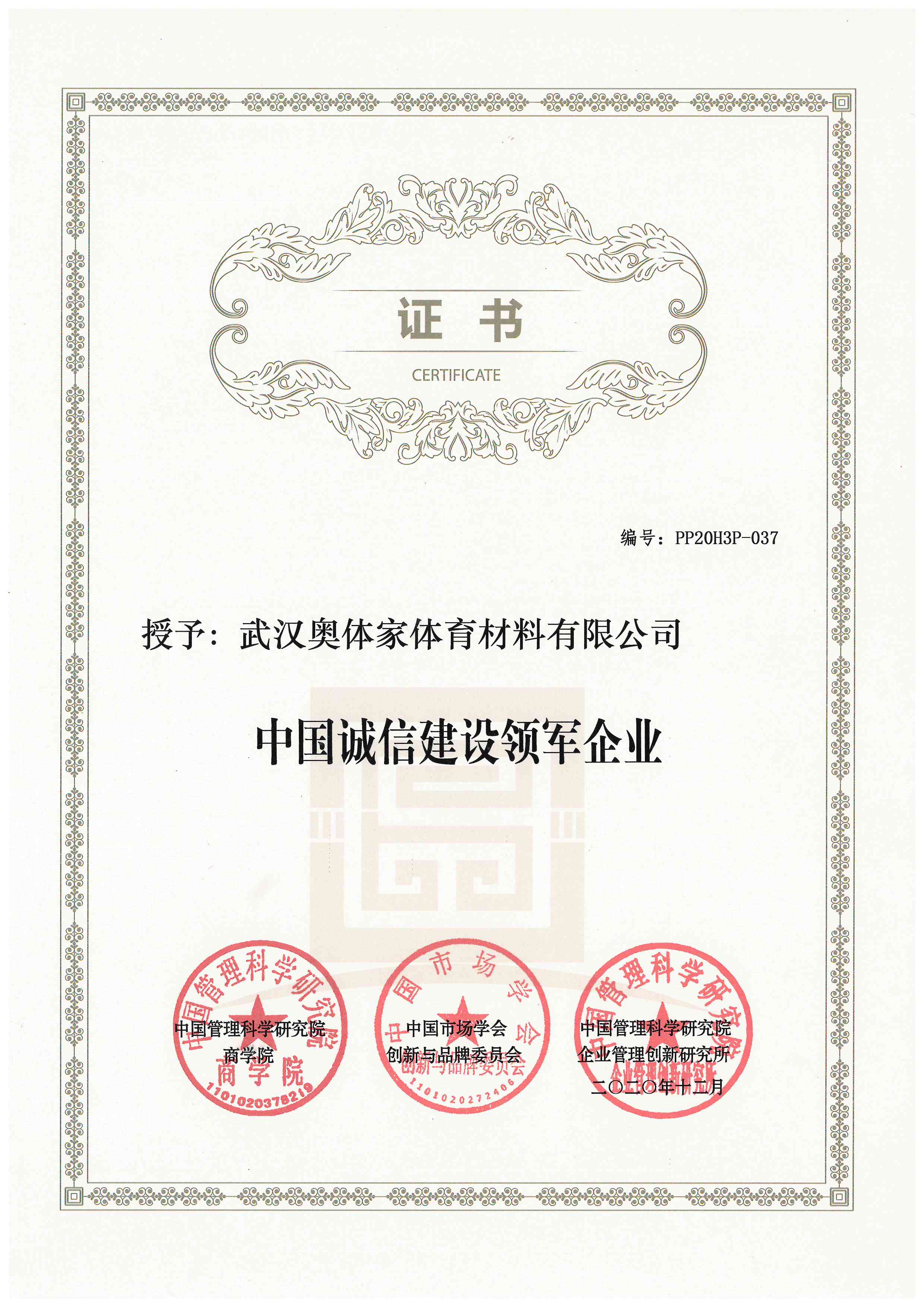 奥体家荣获《中国诚信建设领军企业》证书